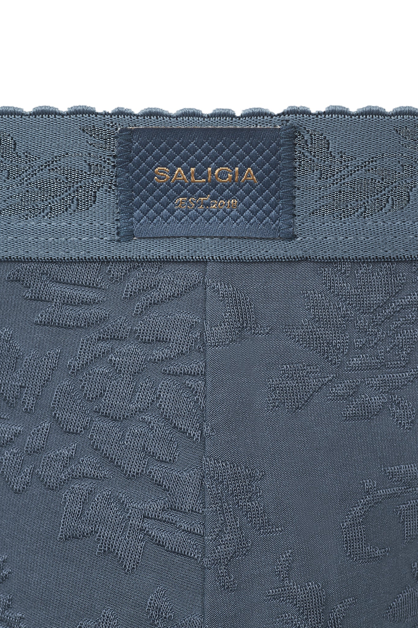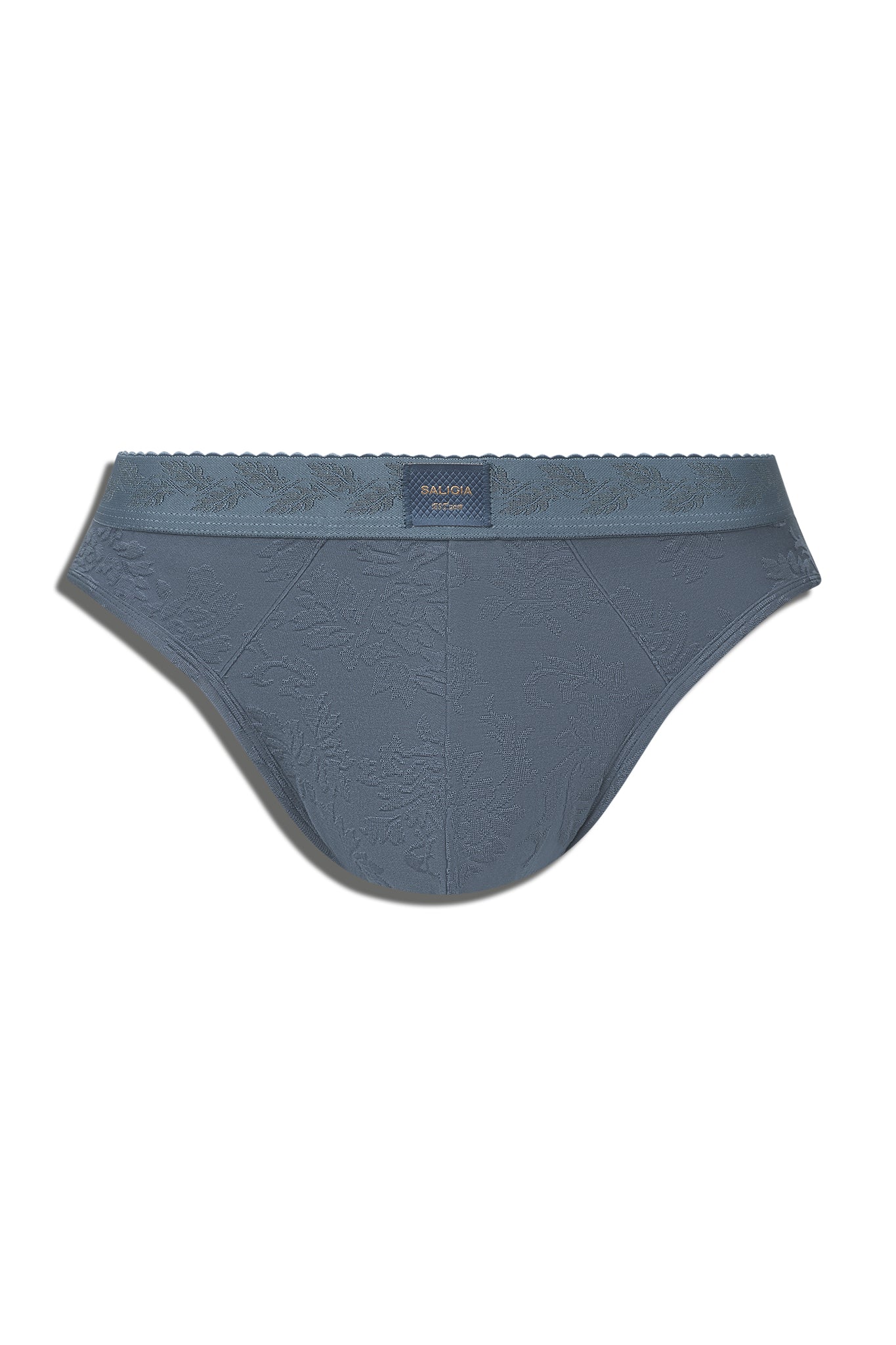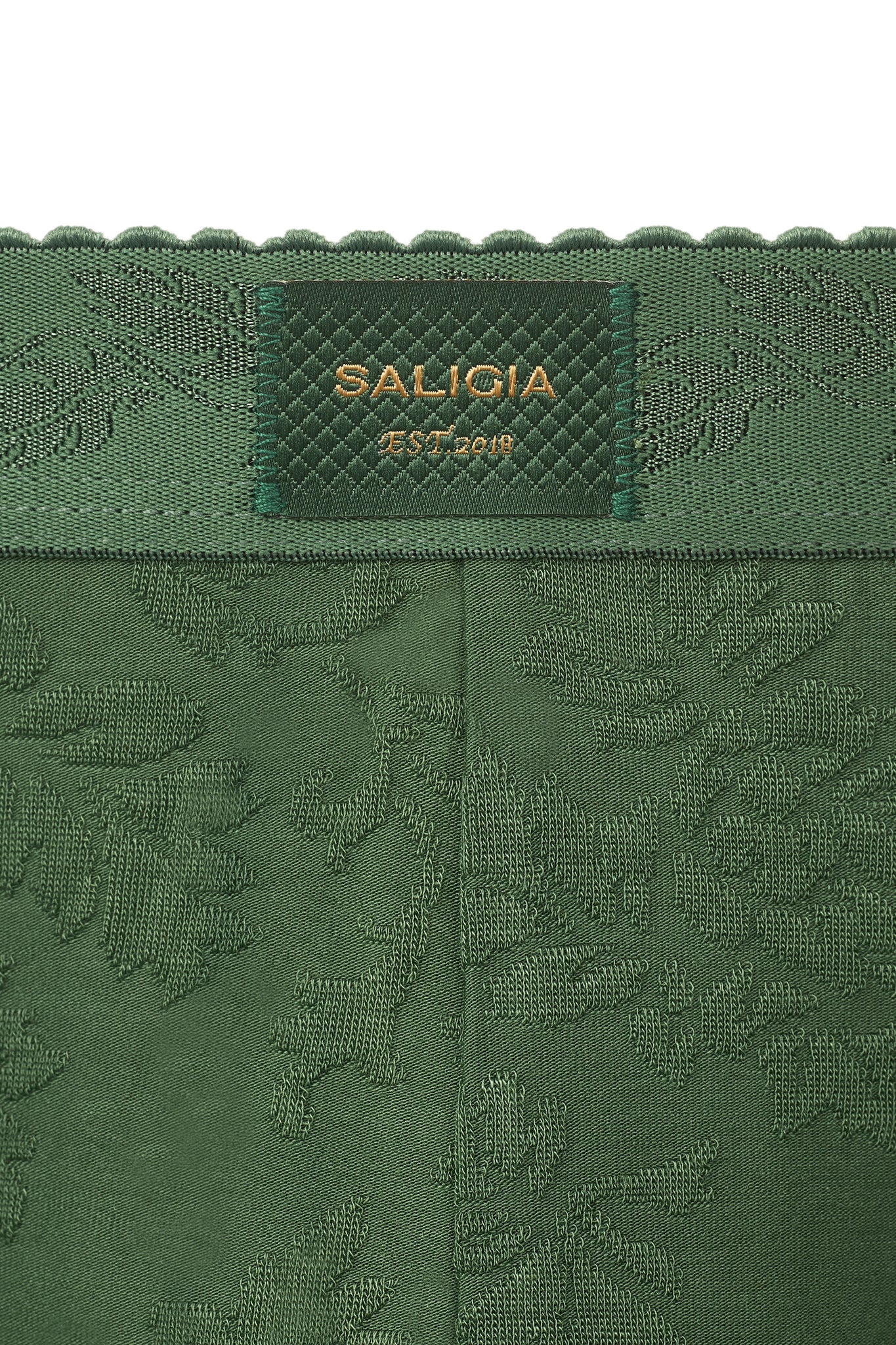 • • Vine-leaf jacquard waistband with a subtle tonal pattern